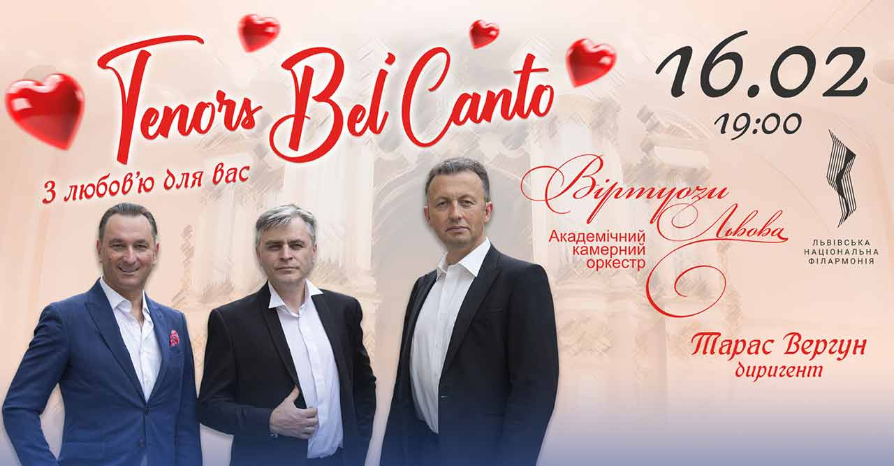 «Tenors Bel’Canto» — колектив, який об’єднали непересічний талант, природний шарм і справжня дружба. Вони щоразу збирають аншлаги. Їхні концерти чекають із нетерпінням. Їх завше вітають гучними оваціями та довго затримують на сцені рясним «Браво! Біс!». В цей вечір їхні голоси прозвучать у супроводі «Віртуозів Львова», а програма, яку «Tenors Bel’Canto» представлять разом з оркестром обʼєднає знані оперні арії, хіти світової естради та улюблені українські пісні.