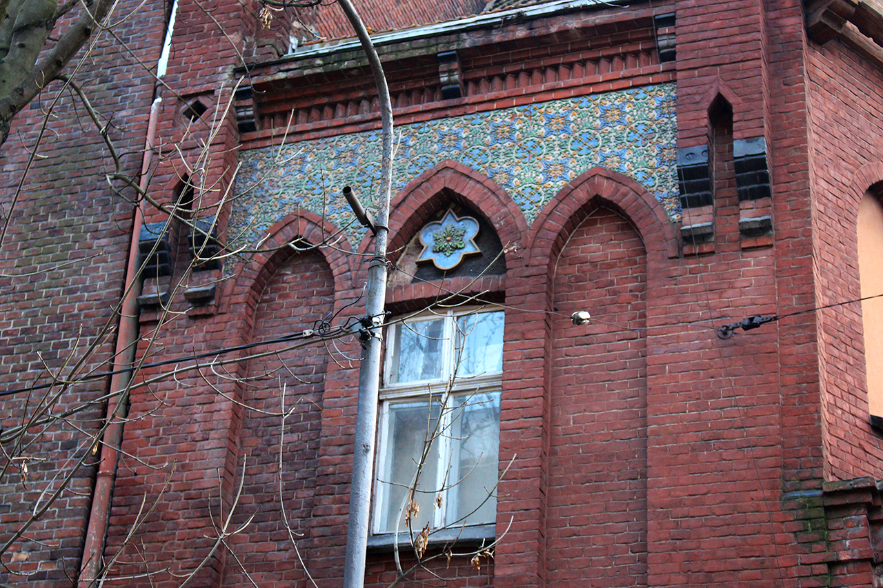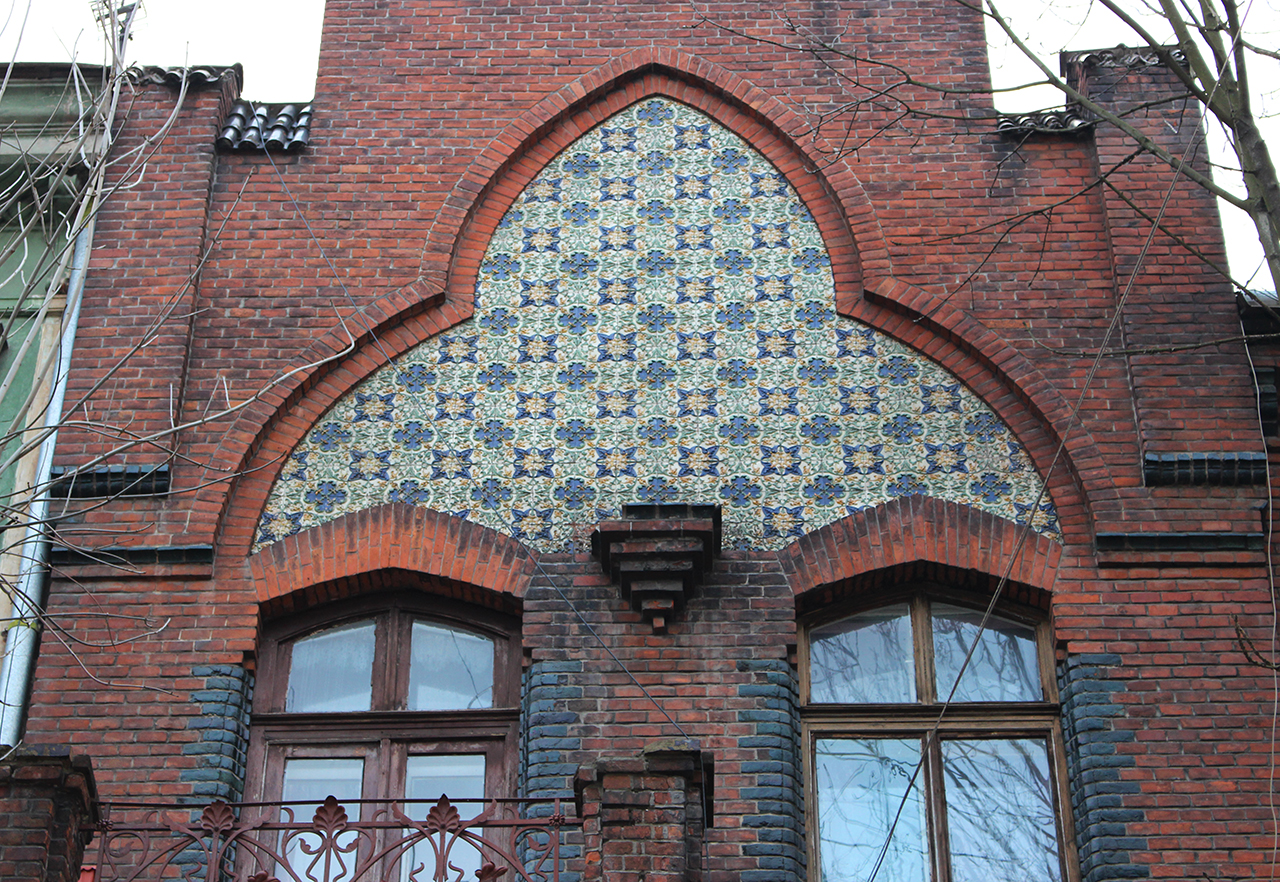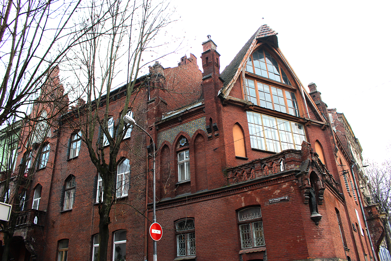 Основою композиції наріжного будинку стала майстерня Стики з великим вікном. Фасад будинку декорований орнаментами з цегли та керамічних кахлів. Над входом – картуш із трьома щитами – гербовий знак цеху малярів.
