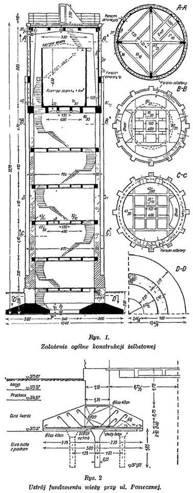 Спорудженню передували кілька ескізних проектів. Через значне падіння цін на цеглу обрано варіант із нетинькованими фасадами з червоної цегли. Застосовано залізобетонні елементи. Зовні вежі мають форму дванадцятигранників із пілонами на кутах. Обладнані оглядовими майданчиками. Статичні обчислення зробив інженер Адам Курилло. Реалізовано у 1932–1933 роках.