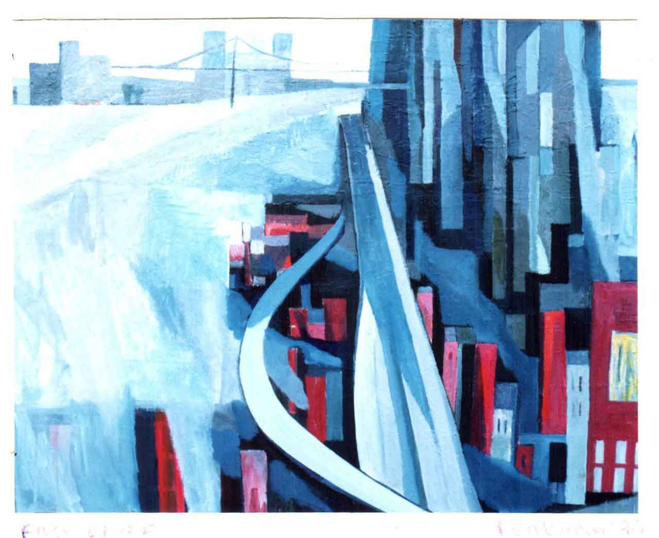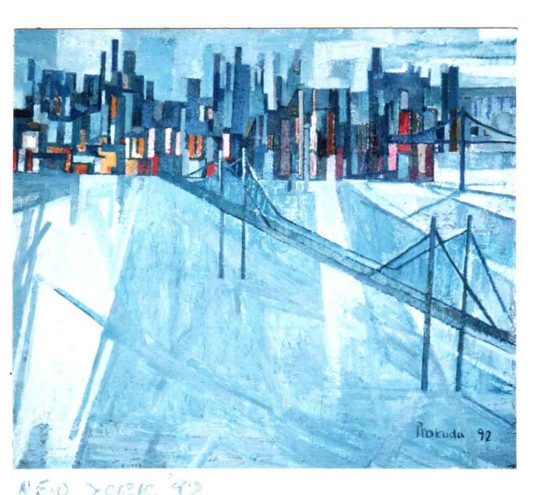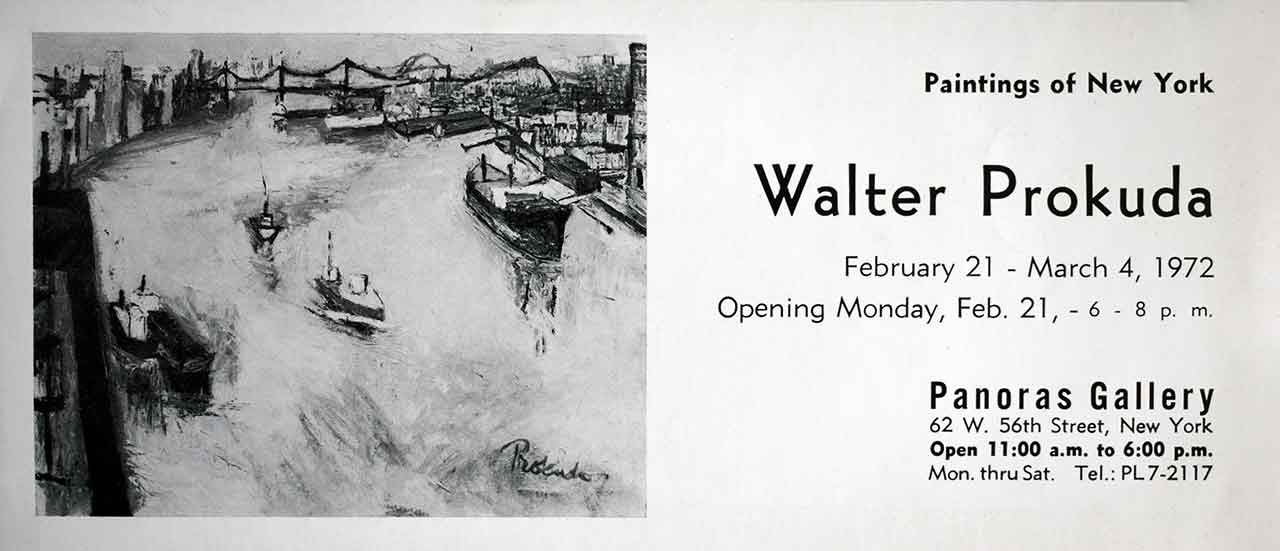 Винесена на запрошення репродукція одного з експонованих пейзажів (на жаль, інші твори з виставки так і не були задокументовані каталогом і на сьогодні не є доступними для аналітики) частково підтверджує слова інтерпретації Ю. Соловієм настроєвої палітри автора при поетизації найбільшого американського мегаполіса. Вже на цьому мотиві з мостами і пливучими баржами Володимир Прокуда віртуозно передав засобами пластики стан власної екзистенції, поетичної настанови до простору. Розвиваючи свій погляд на творчу методологію мистця, Ю. Соловій підсумував, що «малярство Прокуди є на межовій границі – на границі між імпресіонізмом і проблемами сучасного малярства: ″імпресіоністичне коливання повітря″ кидає на це малярство тінь, яка повинна зникнути, поскільки в мистецтві не шукаємо досконалої маніфестації шляху за нами, а розглядаємося насамперед за новим об’явленням» [17].