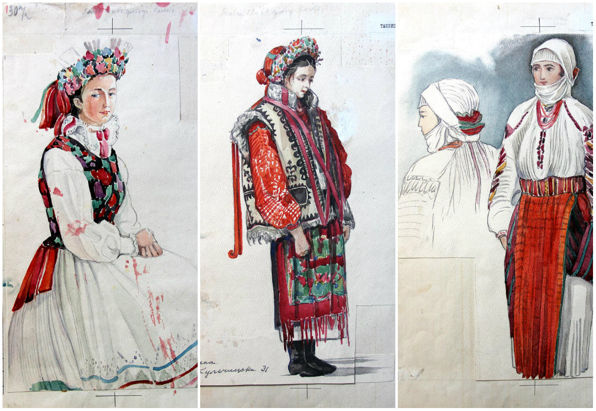 Тут представлено 49 акварельних малюнків із зображенням народного вбрання різних етнографічних регіонів Західної України – Поділля, Гуцульщини, Буковини, Покуття, Бойківщини, Опілля, Полісся та Волині, Лемківщини, околиць Перемишля.