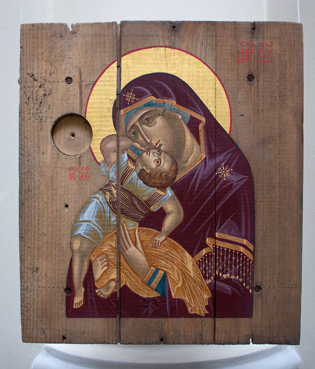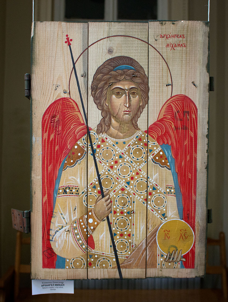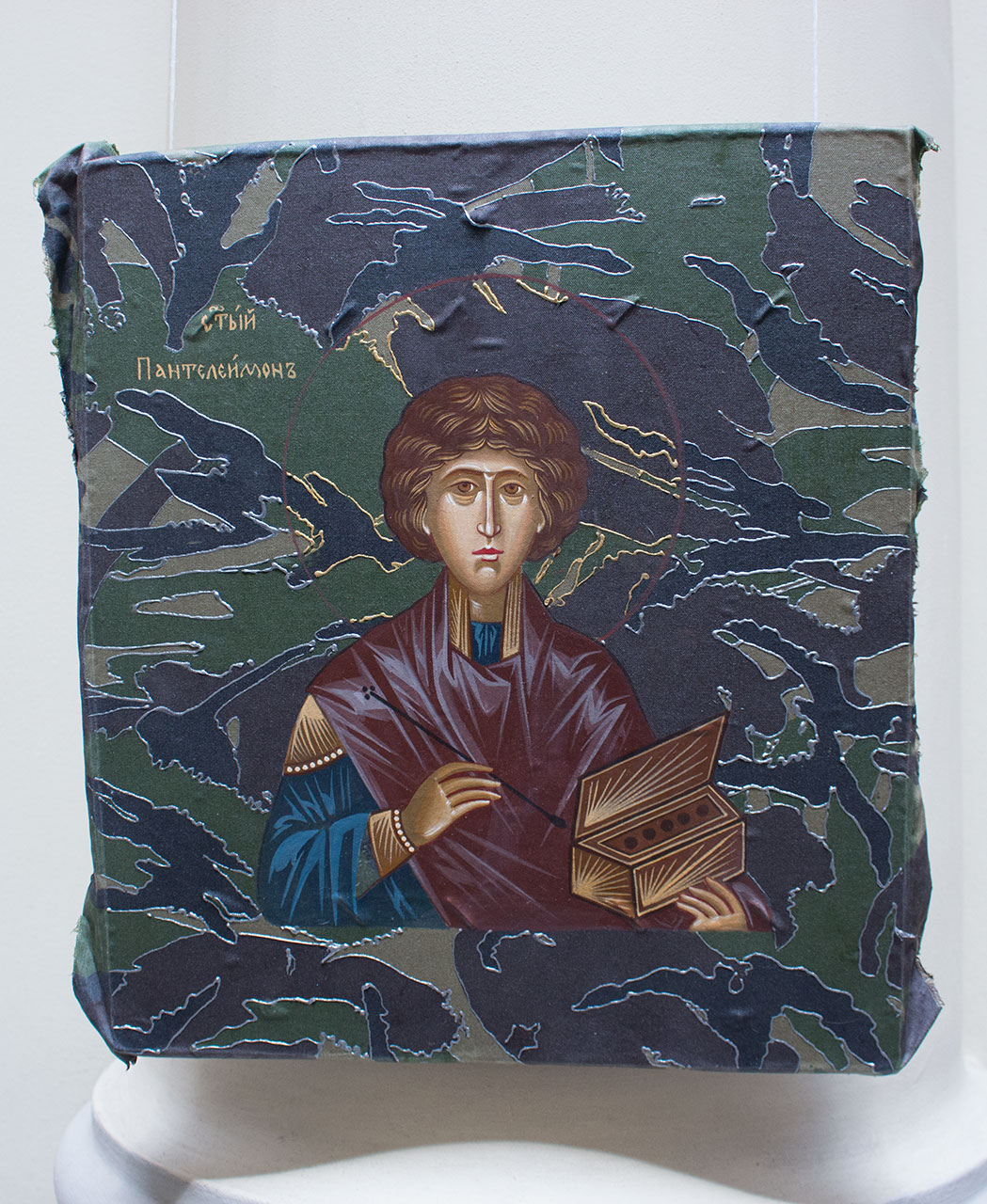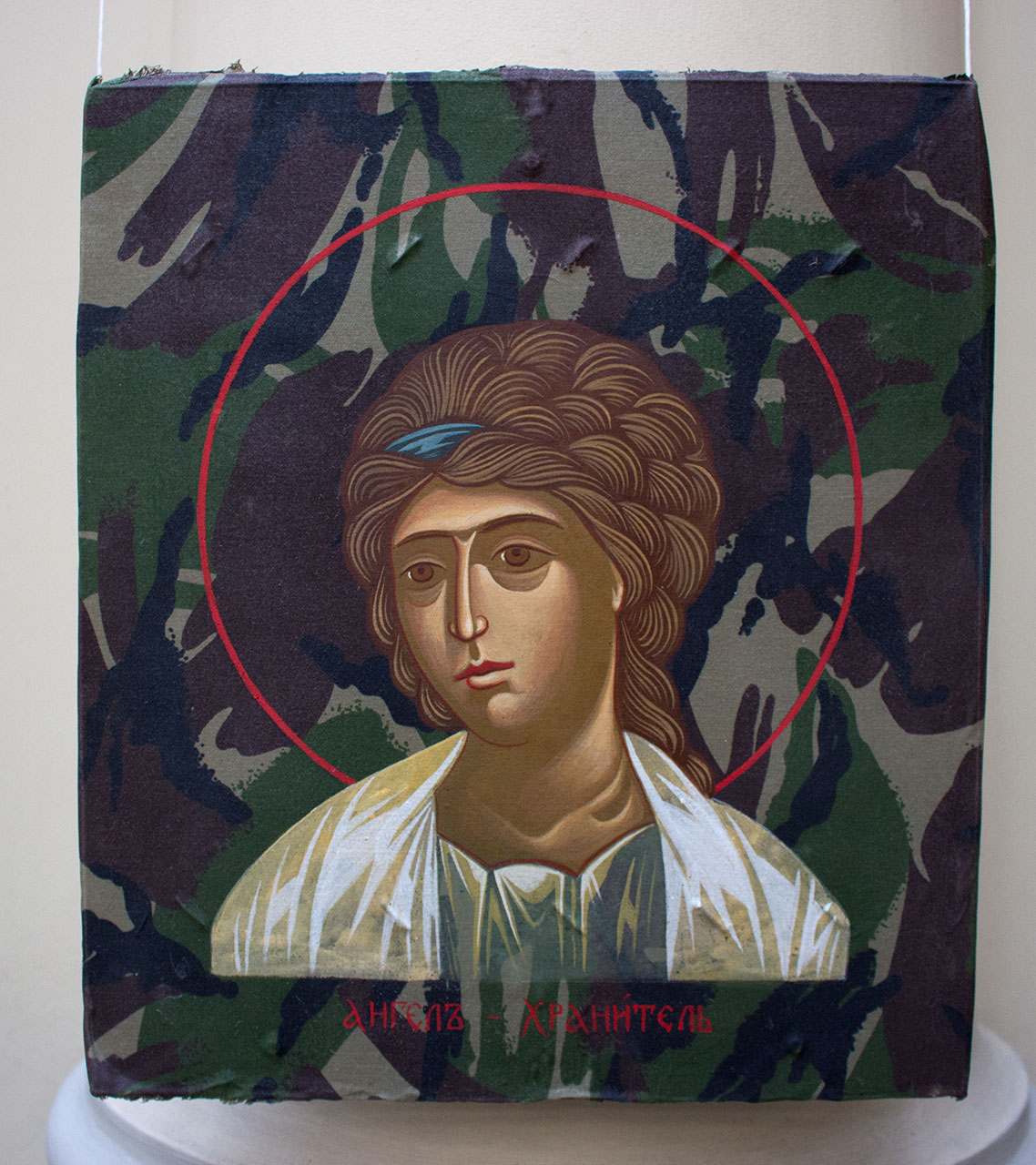 «Я поїхав у добровольчий батальйон і побачив, що ящики від набоїв схожі на дошки, на яких ми працюємо: на вигляд вони дуже давні. Тому я захотів написати на них ікону. Потім запросив двох художників, і ми працюємо над цим проектом і зараз», – розповів художник.