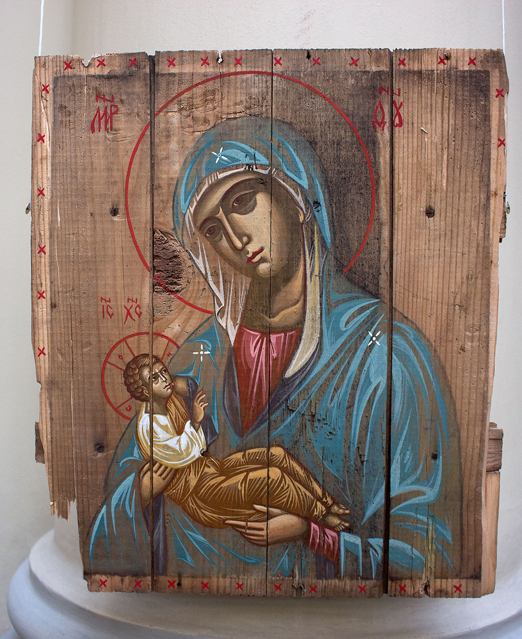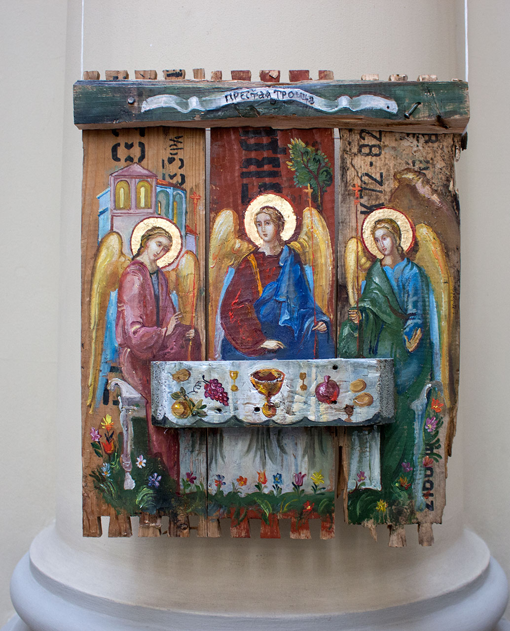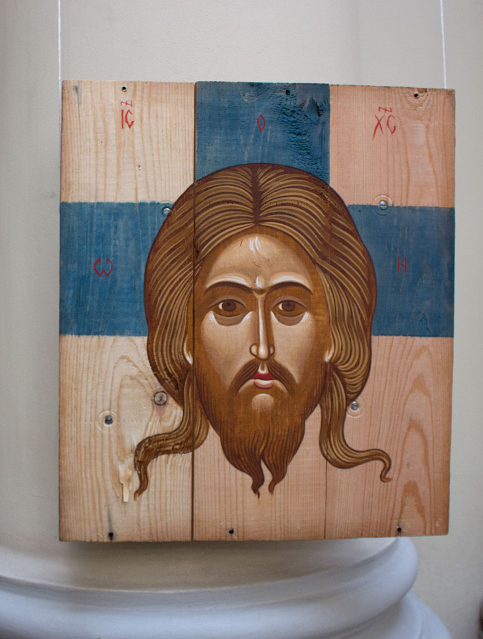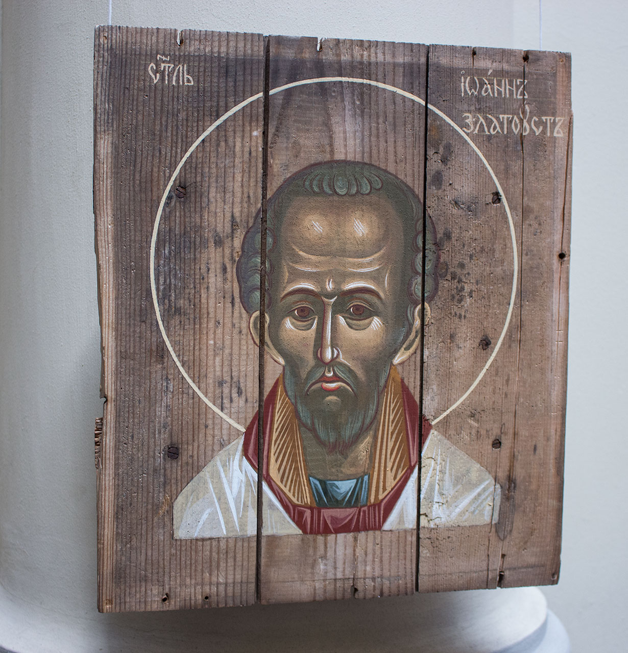 «Я поїхав у добровольчий батальйон і побачив, що ящики від набоїв схожі на дошки, на яких ми працюємо: на вигляд вони дуже давні. Тому я захотів написати на них ікону. Потім запросив двох художників, і ми працюємо над цим проектом і зараз», – розповів художник.