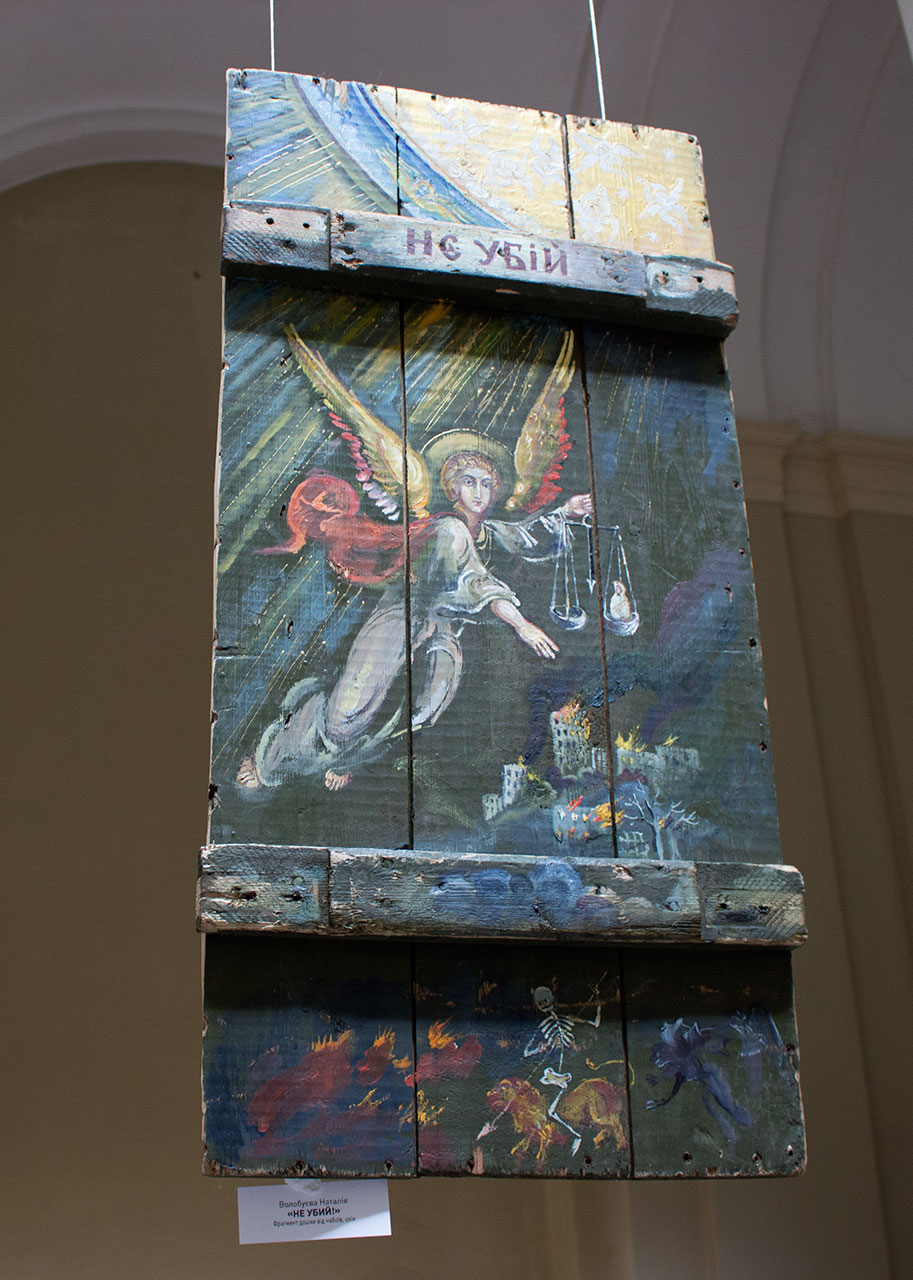 «Ці дошки воювали. Їх привезли з Дебальцевого і Пісків. Дуже важливо, що дошки збирали солдати. Тому це наш спільний проект – митців і бійців. Для нас це неймовірно важливо, – розповів Олександр Клименко. – Також виставкою ми хочемо вивести війну з поля віртуального – ми переживаємо її віртуально у комп’ютері – через ікони, які є свідками цих подій. Ми хочемо і, навчивши не викидати дошки, зробивши їх цінністю, ставитись до наших героїв так само – не кидати їх напризволяще».