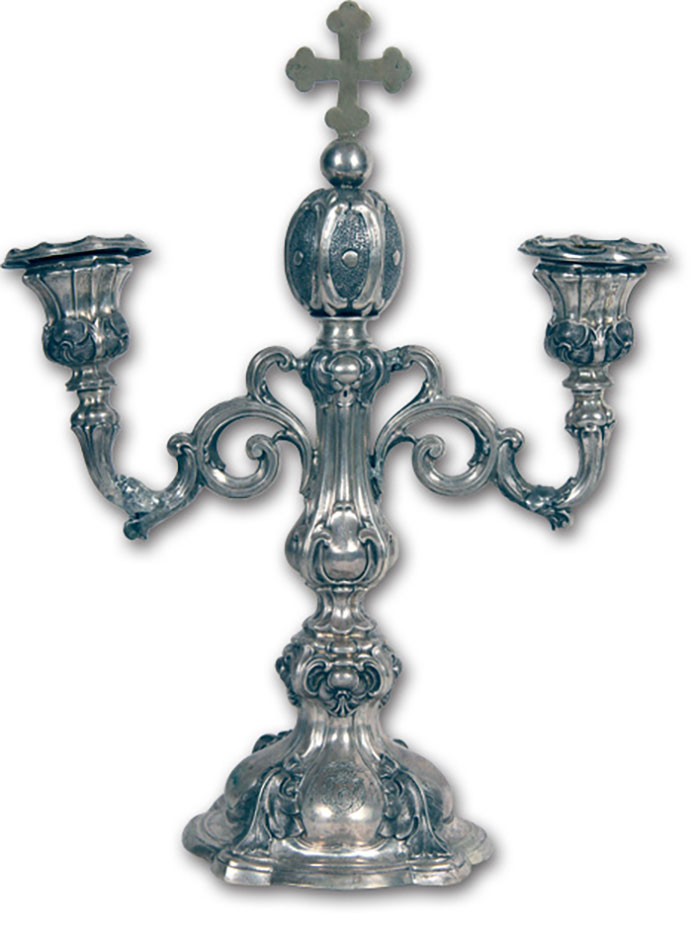 Свічник з гербом митрополита Андрея Шептицького.  1899 р. Срібло, штампування, гравіювання.