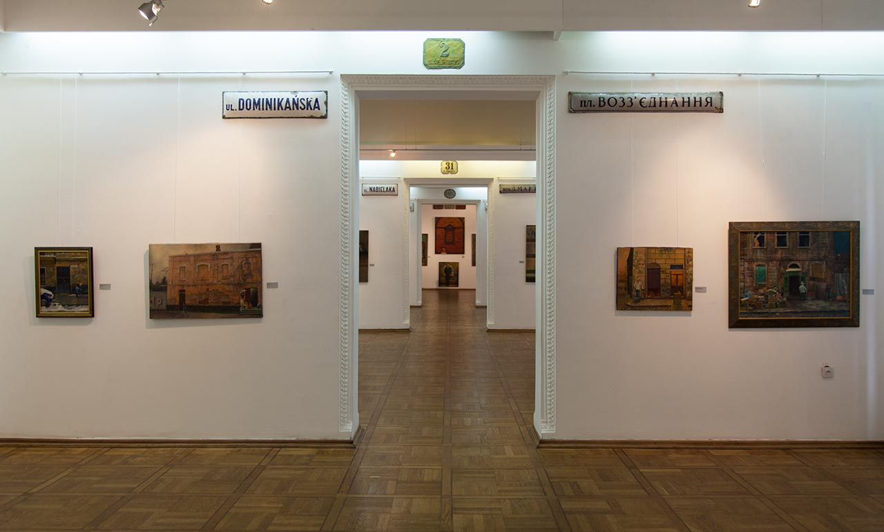 Юрій Кох колекціонує цікавий антикваріат та фотографує старовинні речі. Для серії картин “Стінопис” він шукав різні фрагменти штукатурки, бруківки, різноманітних текстильних елементів і фотографував. Потім у певному стилі моделює, що ж за цим пластом фарби чи цегли може критися. Художник знайшов оригінали табличок старих назв львівських вулиць різними мовами та додав їх до виставки.
