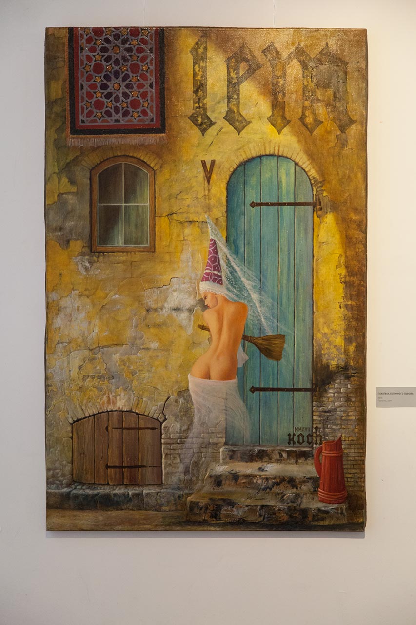 На стінах музею Шептицького роботи з усіх циклів творчості Юрка Коха: стінопис, ардекох, Коханий Львів. У своїх картинах художник поєднує непоєднувані речі.