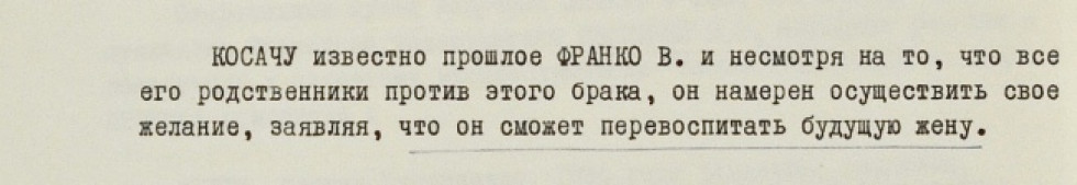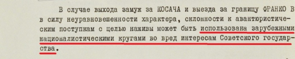 «У разі виходу заміж за Косача та виїзду за кордон Франко з огляду на неврівноваженість характеру, схильність до авантюристичних вчинків з метою наживи може бути використаною закордонними націоналістичними колами на шкоду інтересам Радянської держави», — резюмували автори повідомлення.