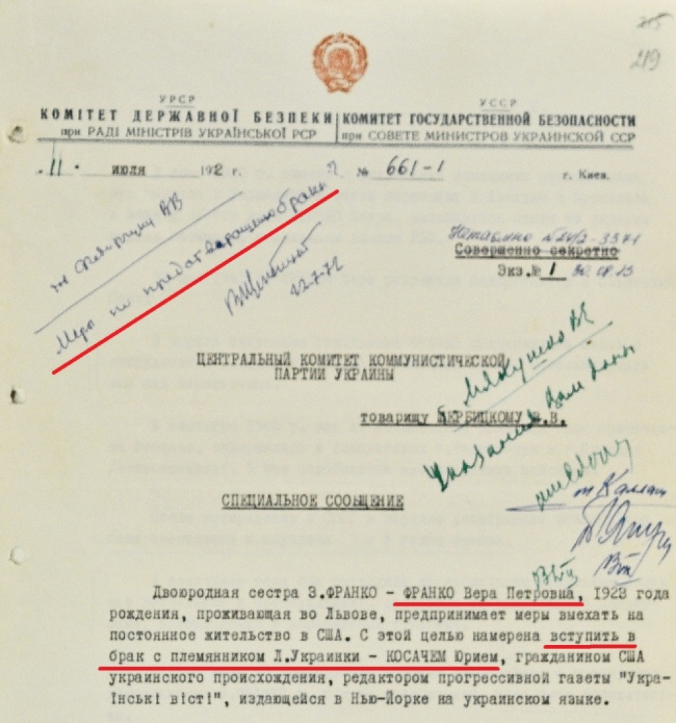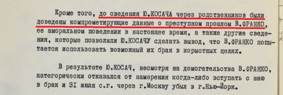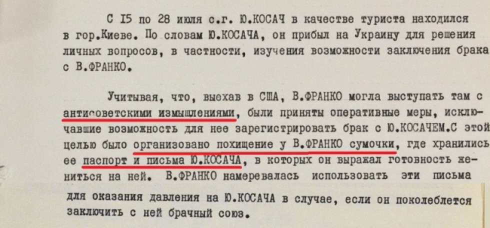 Шлях вирішення цієї проблеми описаний у черговому повідомленні. «З цією метою (для зриву шлюбу — Insider) було організовано викрадення у В. Франко сумочки, де зберігалися її паспорт та листи Ю. Косача, в яких він висловлював готовність одружитися на ній», — рапортує КГБ все тому ж Щербицькому.