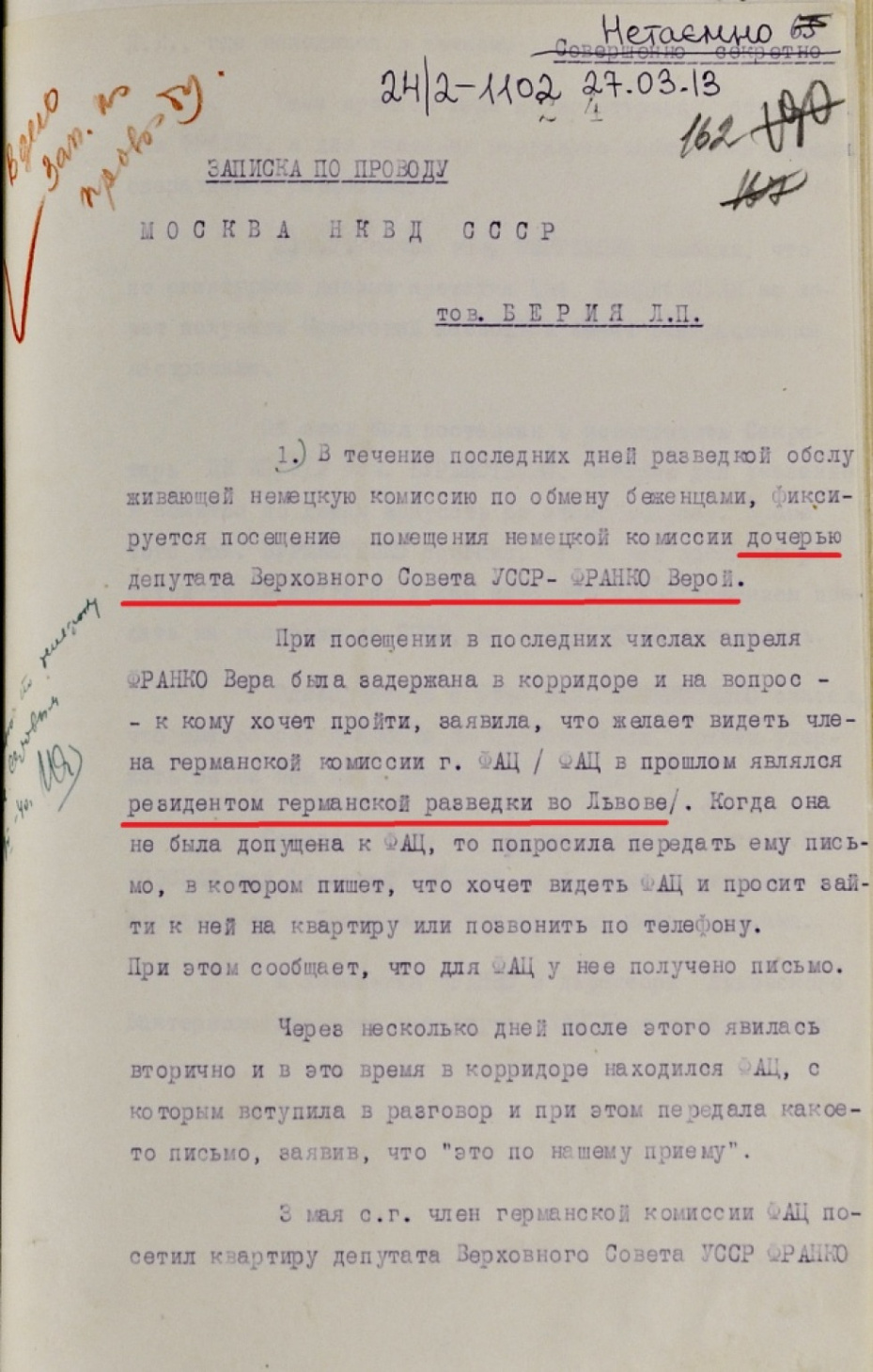 Якось Франко помітили у будівлі німецької комісії з обміну біженцями у Львові. Вона кілька разів зустрілася із членом комісії на прізвище Фац, якого підозрювали у причетності до гітлерівської розвідки. До Віри вирішили відправити агентів НКВС; крім того, за нею встановили посилене зовнішнє спостереження. Повідомлення про можливу співпрацю доньки депутата з розвідкою нацистів дійшло до голови НКВД Лаврентія Берії.