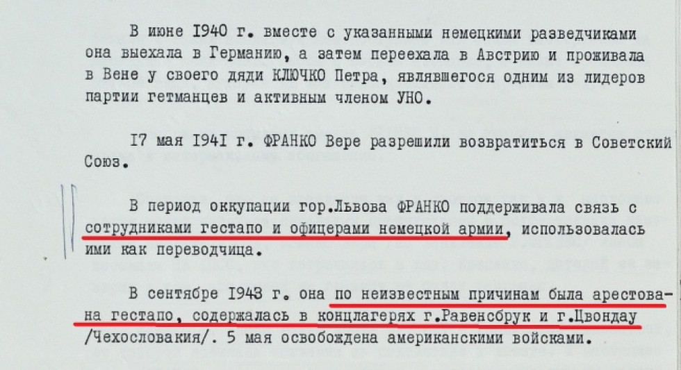 «Звинувачення у роботі на німецьку розвідку Віра Франко відкидала. На допитах вона дуже детально описала своє перебування у Відні та контакти з німецькими офіцерами. Але наполягала, що ті зустрічі або були випадковими, або мали побутовий характер», — каже наукова співробітниця музею «Тюрма на Лонцького» Олеся Ісаюк, яка вивчала ту кримінальну справу.