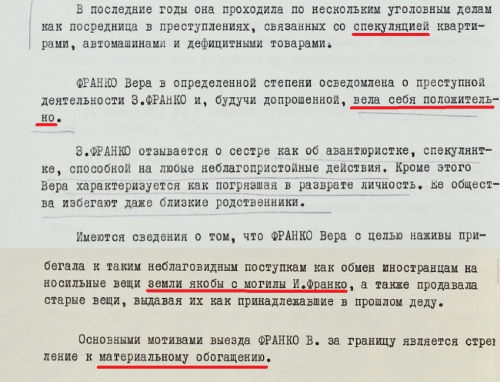«Комітетчики» знаходять єдиний «плюс» у поведінці Віри. Її двоюрідна сестра Зиновія Франко була відомою дисиденткою та цікавила органи держбезпеки набагато більше. Віру викликали на допит стосовно сестри, на якому вона «поводила себе позитивно». Тобто, ймовірно, засуджувала діяльність Зиновії і, можливо, розповіла про неї те, що цікавило КГБ.