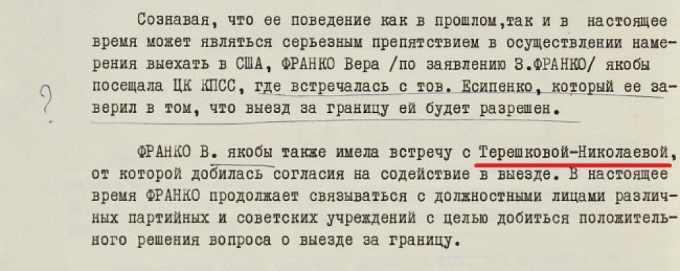 Віра сама усвідомлювала, що з такою біографією отримати дозвіл на переїзд буде важко — навіть якщо вийти за громадянина США. Тому ходила по кабінетах впливових чиновників та партійців, аби ті їй допомогли. Серед них начебто була перша жінка-космонавт, депутатка Верховної Ради СРСР Валентина Терешкова-Ніколаєва.