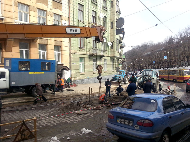 Хоча, слідкуючи за цим ПРОЦЕСОМ я порадів за наш Львівводоканал – аякже навіть обгородили місце робіт – Європа. Але наступного дня 4 квітня, я був сильно розчарований тим, що залишилося на місці грандіозної операції. Дорога, після бездарного повернення бруківки на своє місце, була повністю непридатна для їзди чи ходьби. А навколо залишилася купа піску і та ж таки огорожа.