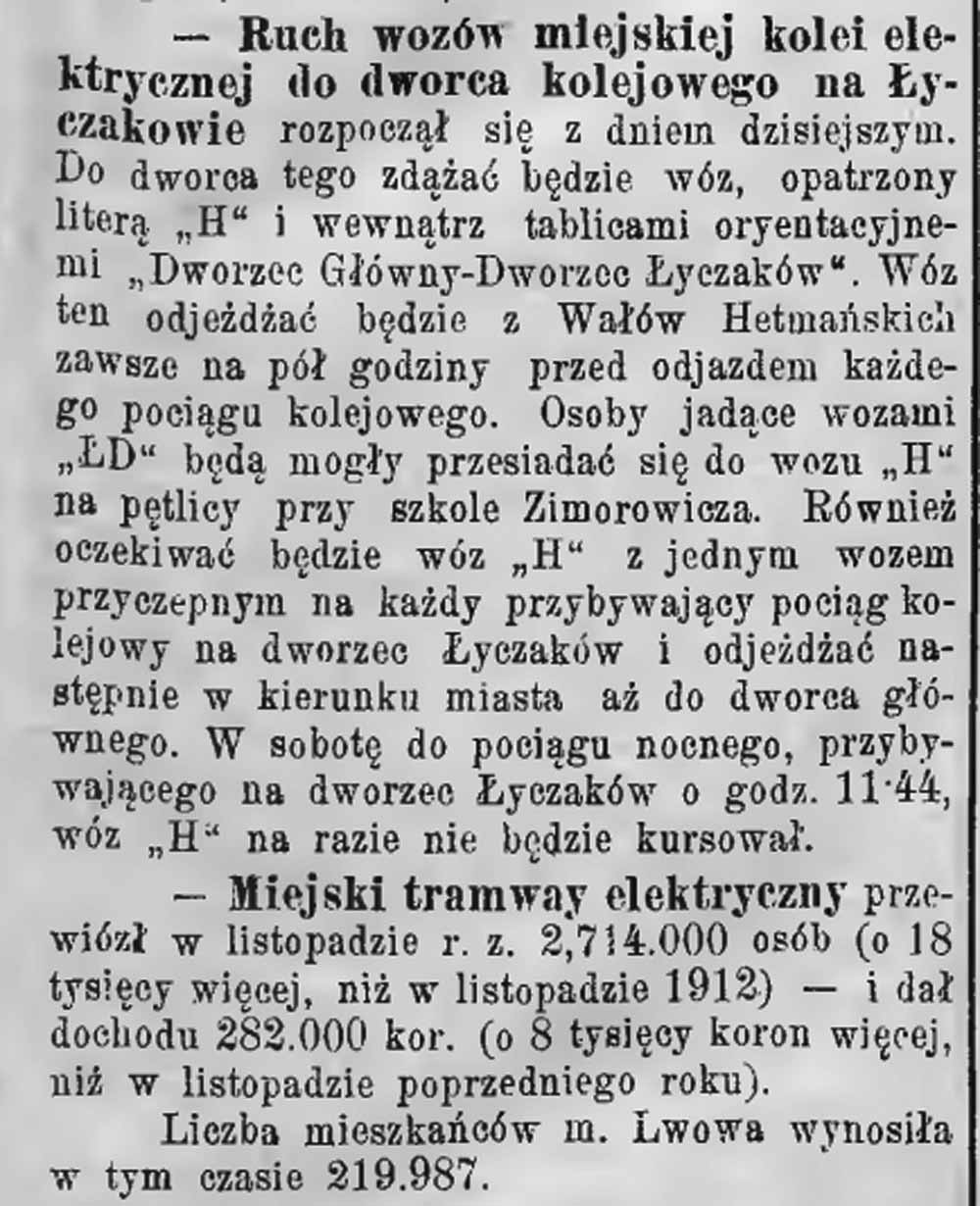 21 лютого 1914 р. у Львові було відкрито останню перед Першою Світовою війною трамвайну лінію – до Личаківського двірця (вокзалу) на локальній залізниці Львів – Потутори – Підгайці. По новій трамвайній лінії почали курсувати трамвайні вагони маршруту Н. «Фотографії Старого Львова» в річницю відкриття трамвайної лінії до Личаківського вокзалу розповідає про її історію.