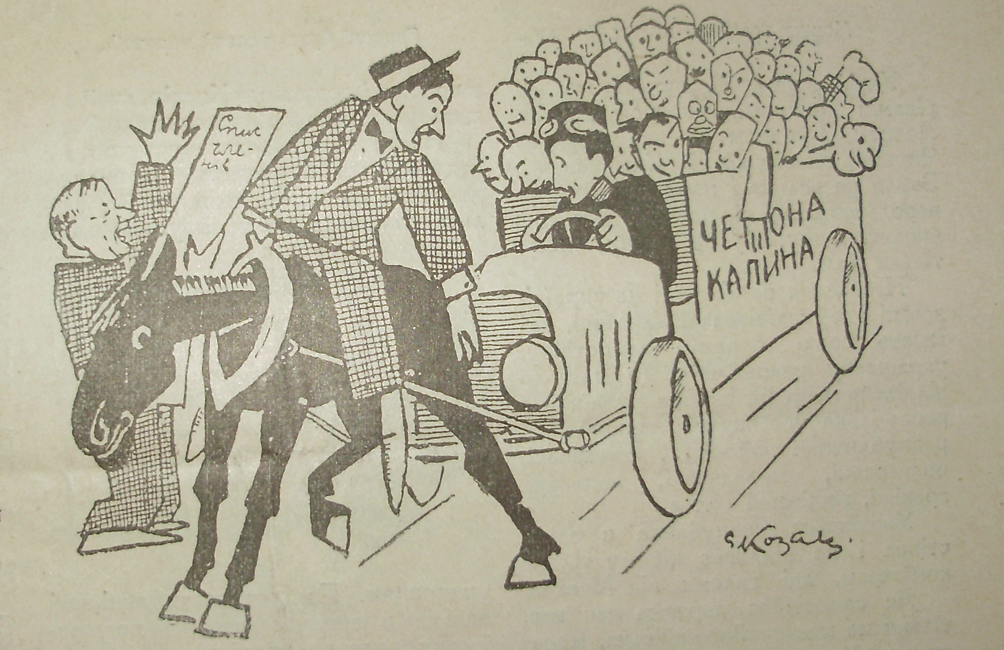 Галицький інтелігент. Навіть сьогодні можна інколи почути словосполучення “галицький інтелігент”. Я ще не відкрив для себе його значення, але Едвард Козак того інтелігента намалював. На початковій шпальті видання за 15 січня 1929 року бачимо цю кумедну карикатуру. Зображення підписано “Недоля нашої преси”. Під ним наступний напис: “Галицький інтелігент: Всьо для тих селян! – а для нас інтелігентів один денник…І то все чогось не достає. Або статті за довгі а букви за дрібні, або статті за дрібні а букви надто великі”.