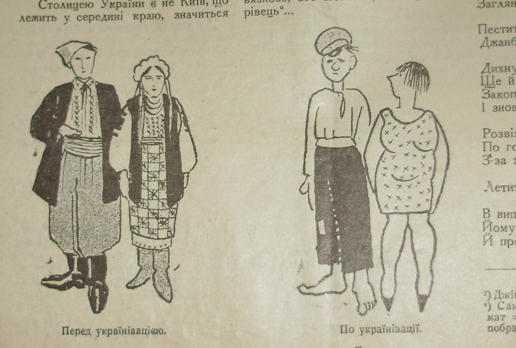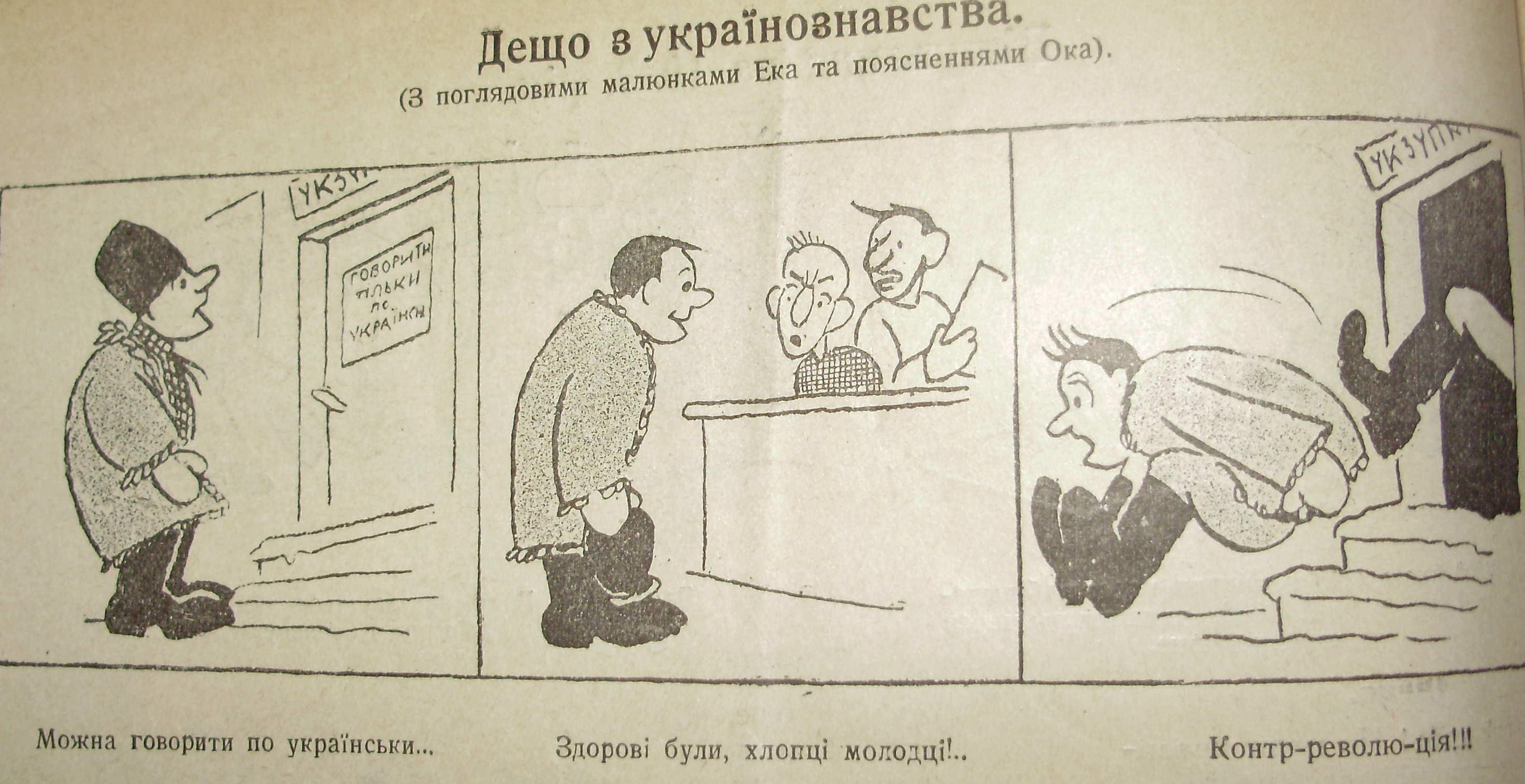 Четвертий жарт. “Україна це край, що лежить над ріками […] та над морями […]. Земля це велика і плодюча, жиє там народ здоровий і рослий. Він має широку душу, буйну вдачу, немає тільки долі. Населення на Україні це українізовані і неукраїнізовані Українці, які мають свою окрему, самостійну, українську республіку […] ця окрема українська республіка має окремі неукраїнські республіки і народи […] татарські, болгарські, молдавські, польські, грецькі, жидівські і т. д. Українська республіка є самостійна […] має все, тільки не має свого війська, монети, гербу, фльоти та заграничного представництва […] Столицею України є не Київ, що лежить у середині краю […], а Харків, який лежить на краю […]. На Україні є богато установ які заєдно українізуються. […] По установах вивішені вивіски з написом ”говоріть по українски”, але по українски ніхто не говорить, бо не має відваги, а хто говорить, то цей має відвагу і є обовязково, або шовіністом, або “петлюрівець”….”