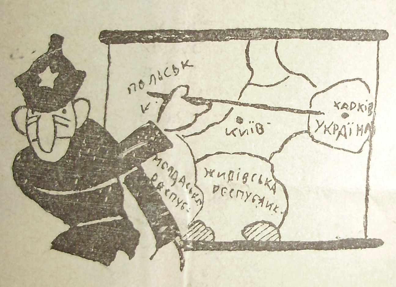 Четвертий жарт. “Україна це край, що лежить над ріками […] та над морями […]. Земля це велика і плодюча, жиє там народ здоровий і рослий. Він має широку душу, буйну вдачу, немає тільки долі. Населення на Україні це українізовані і неукраїнізовані Українці, які мають свою окрему, самостійну, українську республіку […] ця окрема українська республіка має окремі неукраїнські республіки і народи […] татарські, болгарські, молдавські, польські, грецькі, жидівські і т. д. Українська республіка є самостійна […] має все, тільки не має свого війська, монети, гербу, фльоти та заграничного представництва […] Столицею України є не Київ, що лежить у середині краю […], а Харків, який лежить на краю […]. На Україні є богато установ які заєдно українізуються. […] По установах вивішені вивіски з написом ”говоріть по українски”, але по українски ніхто не говорить, бо не має відваги, а хто говорить, то цей має відвагу і є обовязково, або шовіністом, або “петлюрівець”….”