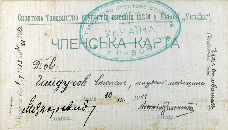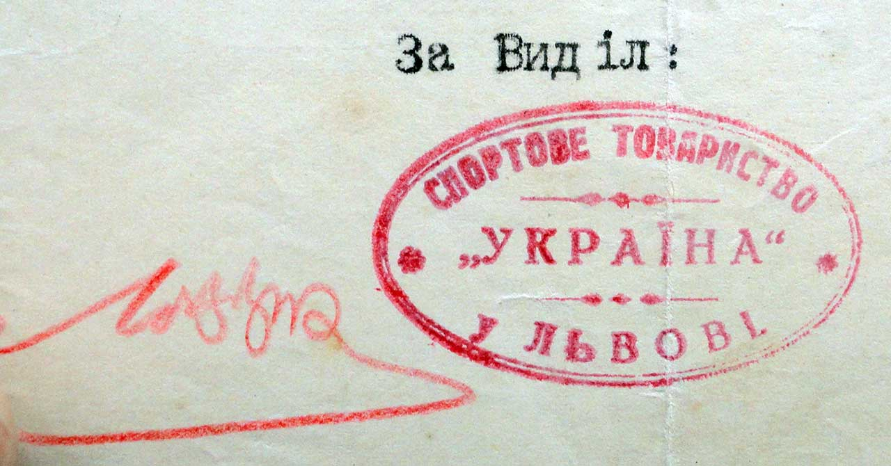 Легенда: Спортове Товариство «УКРАЇНА» у ЛЬВОВІ. Текст розділений двома зірочками.