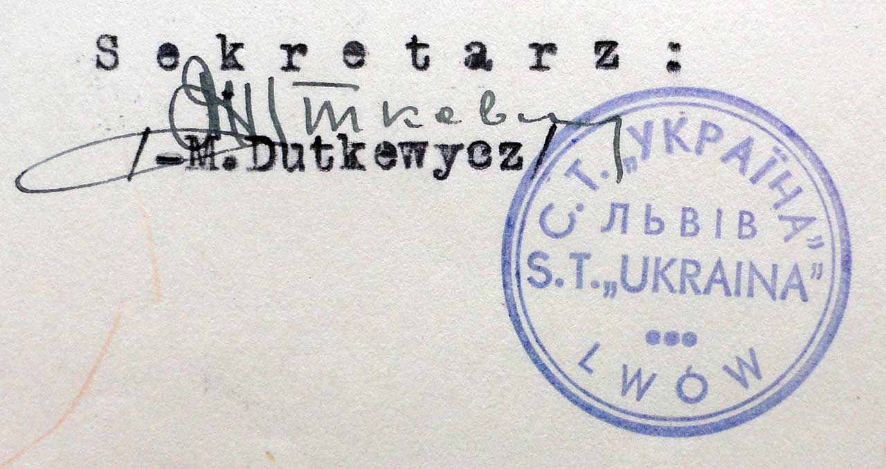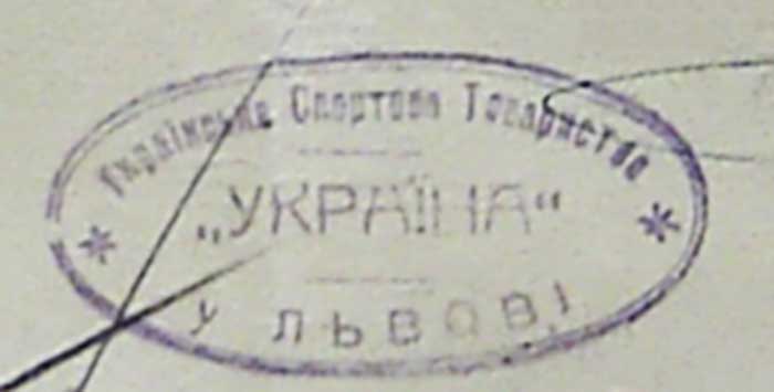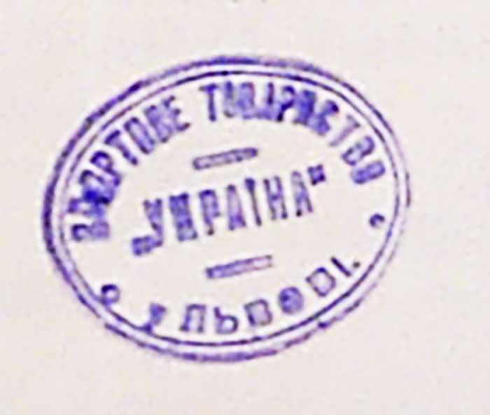 Легенда: С. Т. «УКРАЇНА» ЛЬВІВ S. T. «UKRAINA» LWÓW. Текст розділений трьома крапочками.
