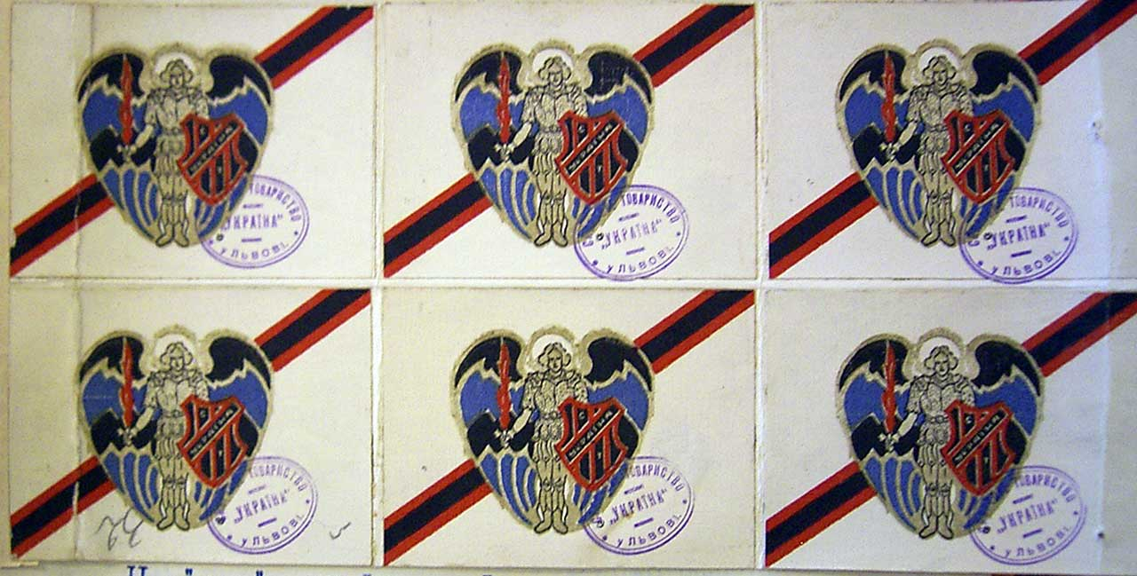 Печатки. Одним із обов’язкових атрибутів офіційно зареєстрованого СТ «Україна» були печатки. Ними завіряли всі важливі документи. Зі зміною статуту змінювалися і печатки. На сьогоднішній день відомо п’ять різних відбитків печаток централі СТ «Україна». Датуються вони 1911–30-ми рр. Існували ще й печатки структурних підрозділів СТ «Україна». Про них готується окрема публікація.