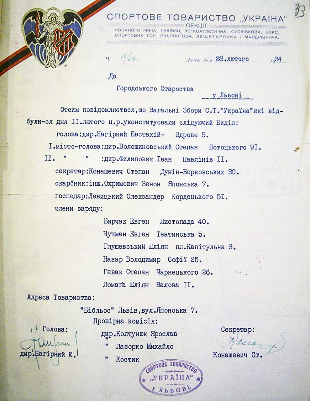 Промову закінчив голова окликом «Слава», який зібрані тричі повторили. Рівночасно вивішено червоно-чорно-червону хоругов «України». Потім гол[ова] відчитав телєґрами і привіти від ріжних спортових установ, а саме: від проф[есора] [Івана] Боберського з Канади, від спортових товариств: «Беркут» (Перемишль), «Запороже» (Кути), «Підгіря» (Дрогобич), нім[ецького] спорт[ового] клюбу «Vis» (Львів), від Українського Студ[ентського] Спорт[ового] Клюбу (Краків), від «Плаю» (Львів), від спорт[ової] секції Тов[ариств]а «Просвіта» (Рівне), від краєвого Тов[ариств]а охорони дітей [і опіки над молоддю] (Львів), від спорт[ової] секції Сокола IV. (Львів), від спорт[ового] кружка української гімназії у Львові, від «Спартанки» (Перемишль), від Верх[овної] Пласт[ової] Команди, від ред[акції] «Ostdeutsches Volksblat-y» (Львів), від інж[енера] М. Козака (Німеччина) і багато ин[ших]».