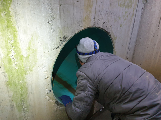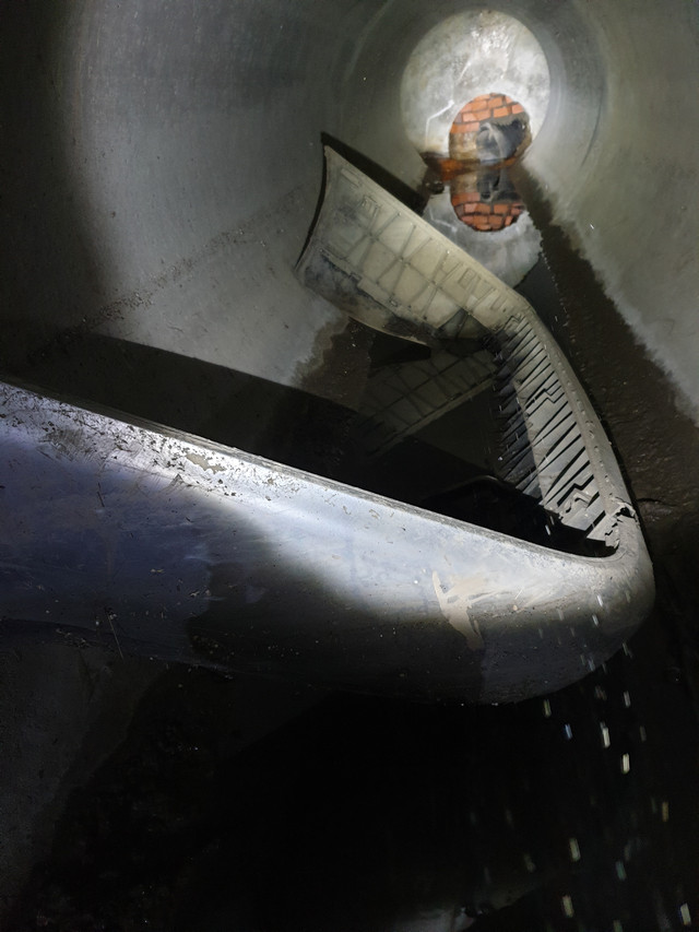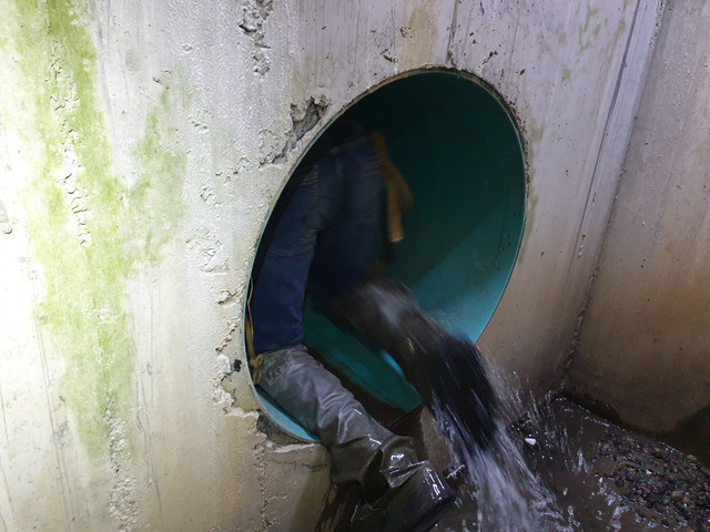 Тепер глянемо на поверхні що тут робиться. Чистий витік води з водопадом, що живить Зубру йде від споруд Водоканалу на Стрийській 123. Води тут реально багато, але чомусь є запах хлору. Цей газ використовували для атак у першу світову війну. Не маючи протигазів вирішуємо хлорку не випробовувати.