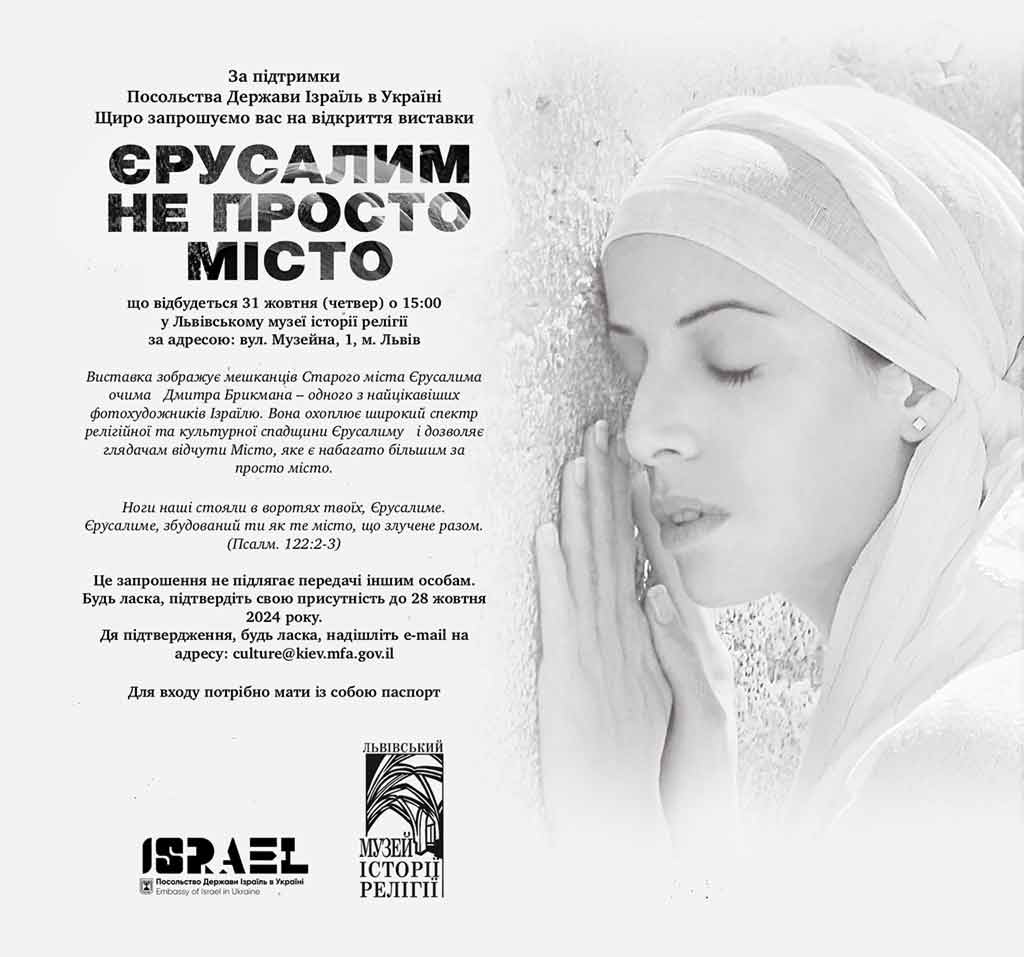 З 1 листопада 2024 року протягом місяця у Львівському музеї історії релігії (пл. Музейна, 1) експонуватиметься фотовиставка Дмитра Брікмана “Єрусалим – не просто місто”.