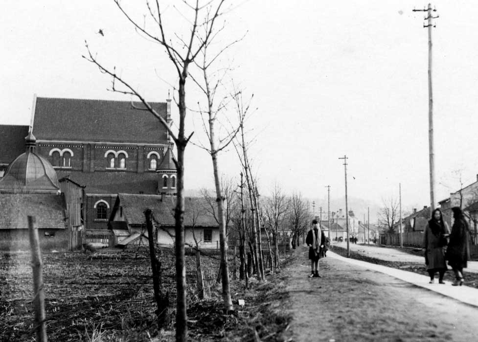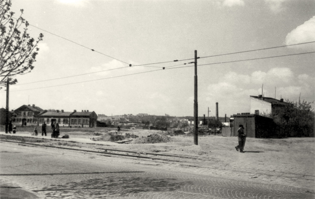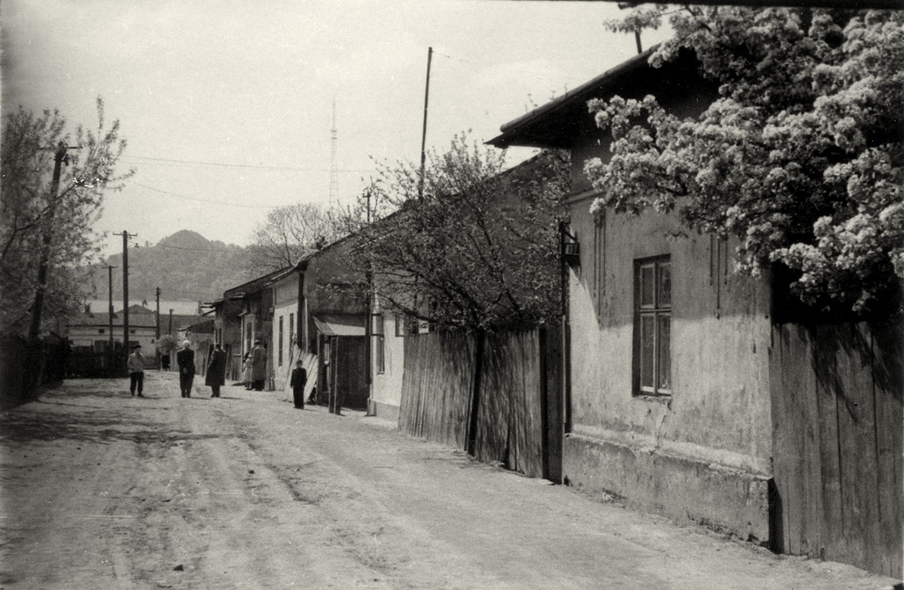 Така сама перспектива зустрічається на ще одній світлині Ю. Дороша. Це вулиця Весняна. З легкістю упізнається найближчий будинок – він іще зберіг ліпнину, хоча втратив вікно і отримав другий поверх. На жаль, від виду на Замкову гору лишився тільки вершечок Копця Люблінської Унії, який можна помітити між будівлею фабрики «Галка» і високим сірим дахом якогось будинку.