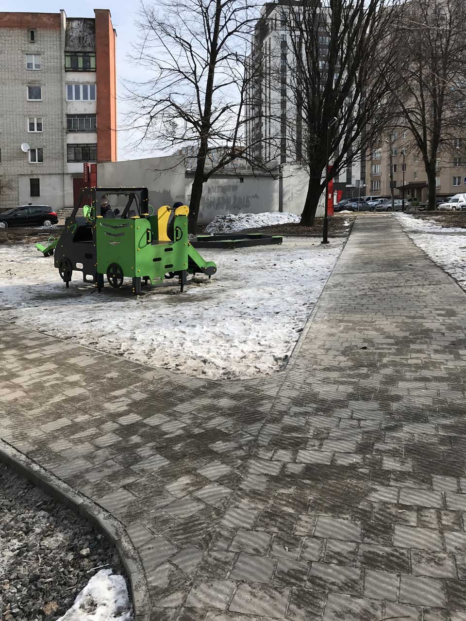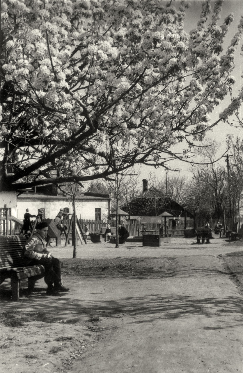 У цьому парку є дитячий майданчик – найстарший в усьому районі. Тож, можливо, син Ю. Дороша відпочиває саме біля неї? На старій світлині видно паркан, який міг тягнутись вздовж вулиці Миртової. У 1980-х роках влада почала забудову цього кварталу високими будинками. П’ятиповерховий будинок, який видно за дитячим майданчиком, збудовано у 1980-х роках.