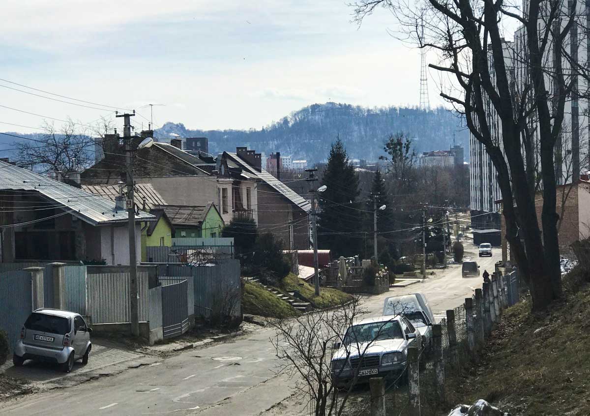 Однак якщо пройтись по Інструментальній в сторону вулиці Лінкольна, то ми побачимо таку саму перспективу Замкової гори. Цей краєвид підтверджує, що фото зроблено з вул. Інструментальної, от тільки місточка і потічка тут ніколи не було.