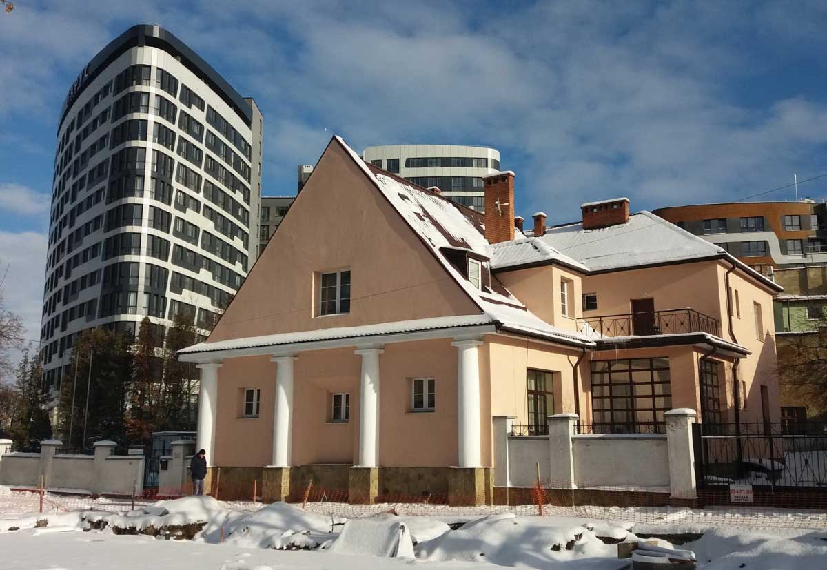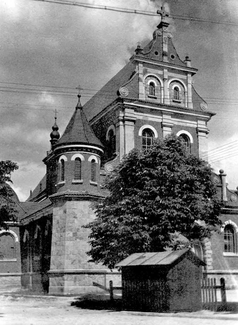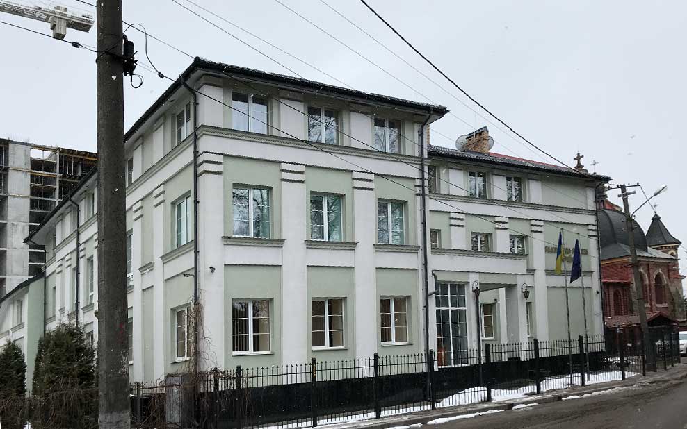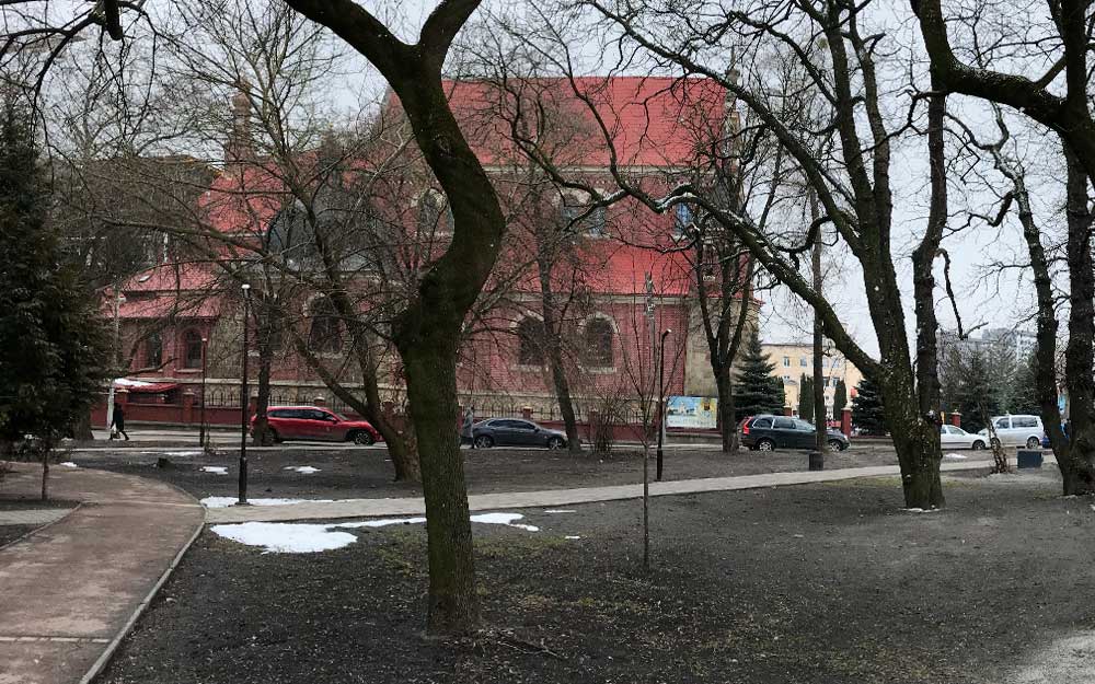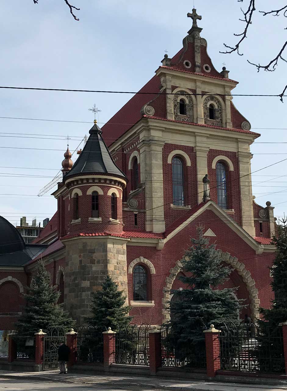 Але не можна цього ж сказати про колишній парафіяльний будинок, який стоїть одразу за храмом. Він був збудований за проєктом В. Дайчака з кінотеатром всередині. В радянські часи тут відбувався перегляд фільмів, які зберігались в недіючому костелі. Потім ця інституція закрилась і нові господарі – Рахункова палата України – зробили реконструкцію з надбудовою. Тепер в цьому будинку годі впізнати попередню будівлю, але, що б там не казали, вийшло гарно.