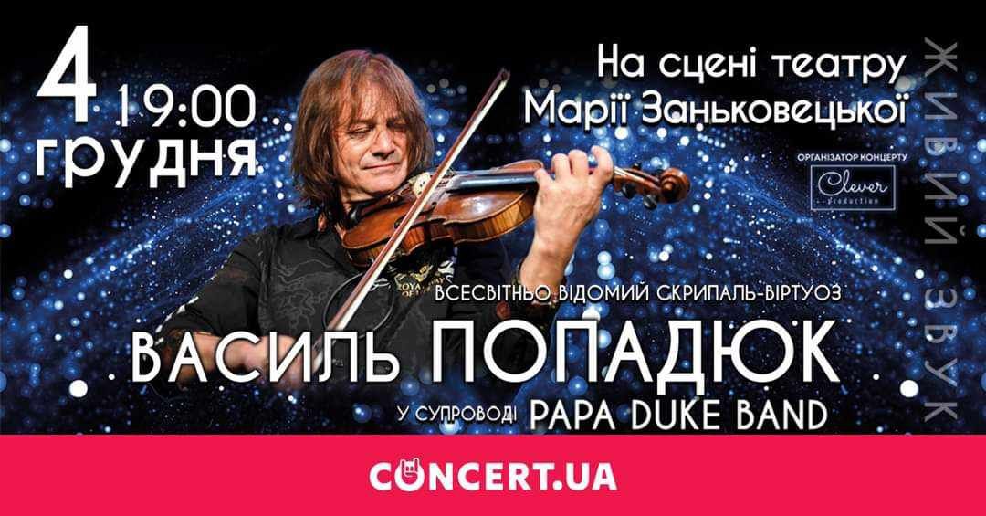 Завтра, 4 грудня 2023 року, о 19.00 у Театрі Марії Заньковецької виступить всесвітньо відомий скрипаль Василь Попадюк. За шедевральну гру на скрипці його прозвали “українським Паганіні”. На сцені театру він виступить разом з Papa Duke Band, повідомили Clever Production.