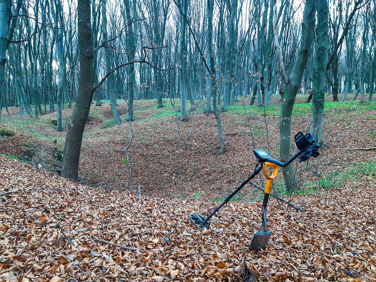Зразу на горбочку поряд із селом починається ліс. На початку лісу якраз і є ця могила, а метрів через 30 починаються уламки від літака. Почали шукати деталі в цьому районі лісу. Великих звісно що немає, бо поруч село.