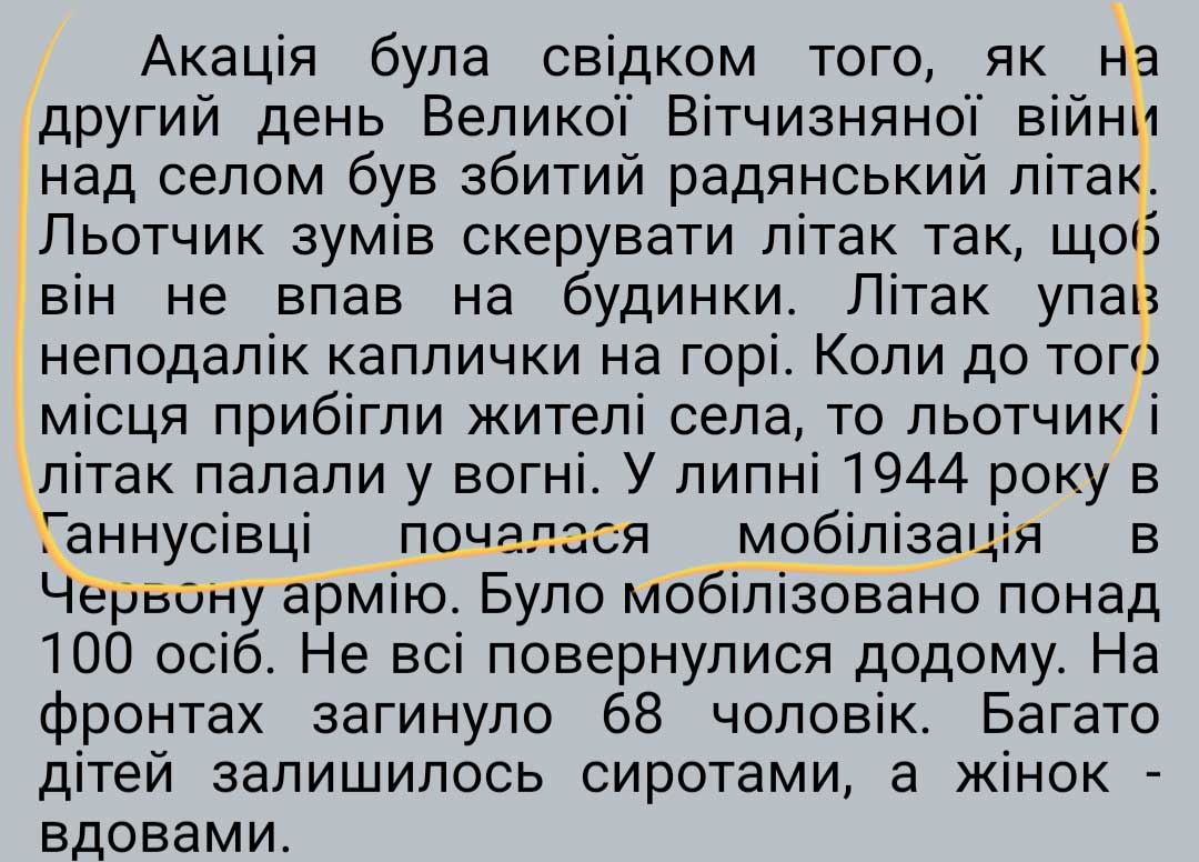 Місцеві розповіли таку історію, що ніби літак кружляв біля села і стріляв по німцях, поклавши дуже багато з них, десь під 200 людей. Але зрештою його збили і він впав.