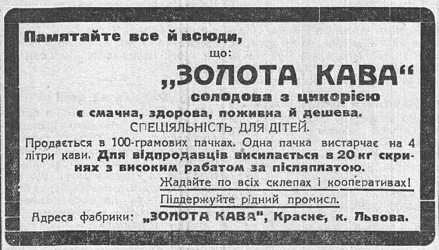 Український промисл і торгівля розбудовуються та постепенно, крок за кроком опановують в першу чергу ділянки першої потреби нашого народу. До цілої низки наших фабрик і промислових підприємств, як мила “Центросоюз”, пасти, васелини, шевського воску і смоли, фарбки “Елєгант”, свічок “Керос”, туюк і паперців “Калина”, цикорії “Луна”, гарбарень, вирібні килимів і т. д. зорганізовано на початку цього року нову українську фабрику в Краснім коло Львова під фірмою “Золота Кава”, що почала виробляти солодову каву з цикорією – “Золоту Каву”.