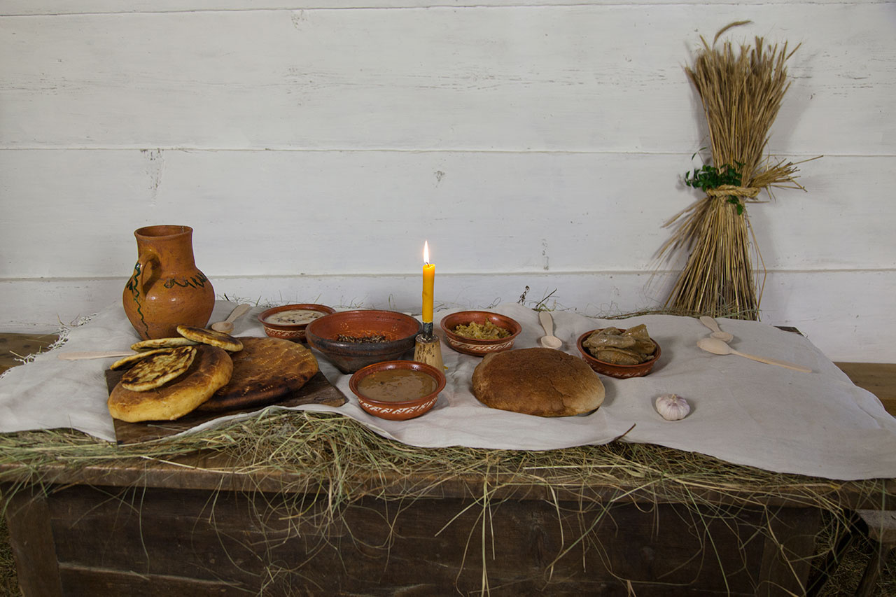 Крім сіна, кладуть у деяких домах, на всіх углах стола, під скатерть зубці гарного здорового чеснику. Це так ради здоровля, для всіх, що засядуть до столу.